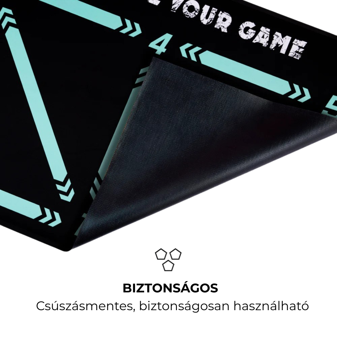 A szőnyeg mérete60 cm x 90 cm, ami ideális a beltéri gyakorláshoz – elég hely a mozgáshoz, de könnyen elfér bármelyik szobában.